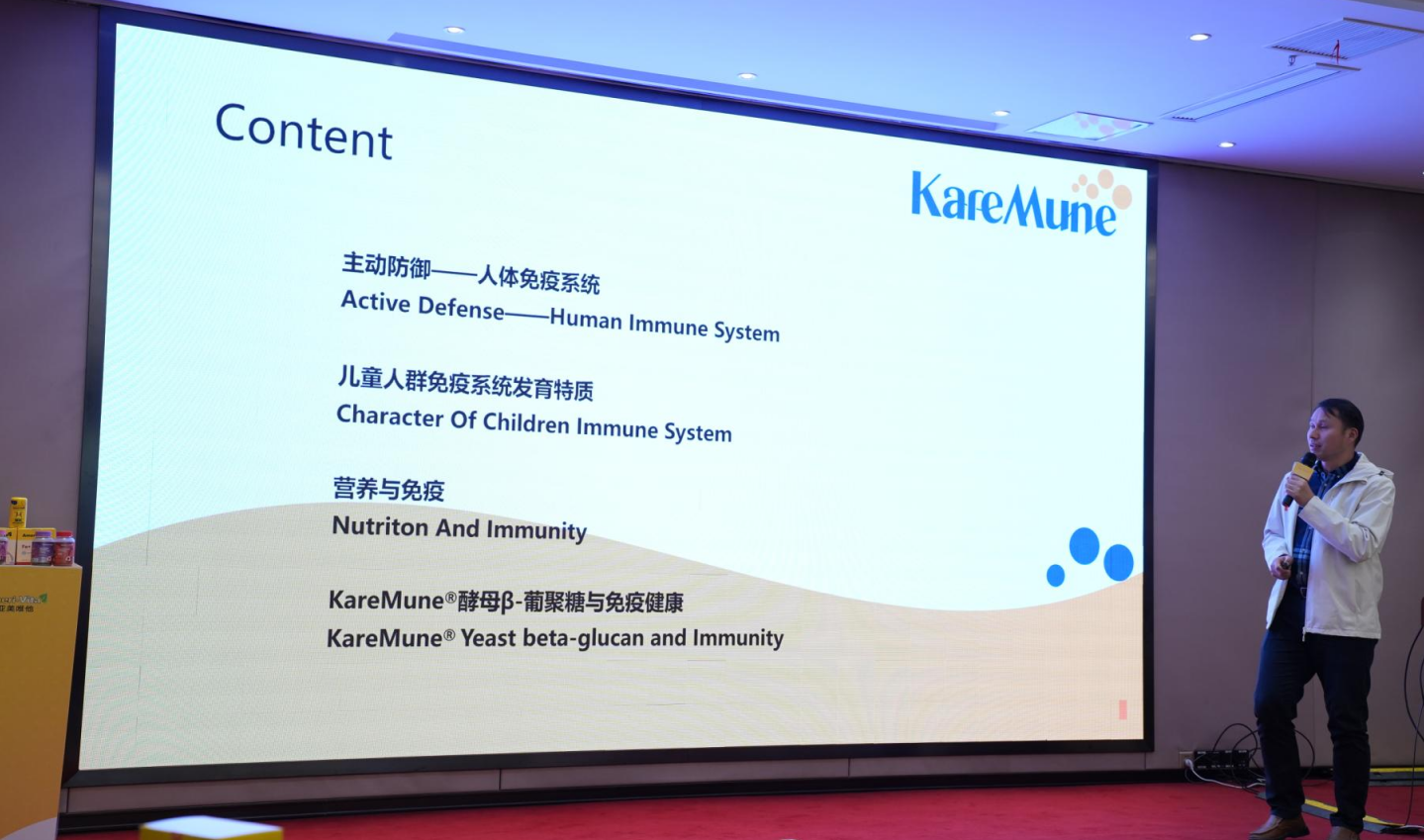 克鲁维酵母科技公司首席研发科学家张海波博士现场揭秘:历时5年研发的突破性技术,通过独创的低温定向酶解工艺,使液体KM酵母β-葡聚糖纯度提升至92%以上,让功能性成分真正实现“有效可见”。不仅通过KAREMUNE®️液体酵母β-葡聚糖激活宝宝稚嫩的免疫防线,为宝贝的健康成长筑起第一道智慧的屏障,而且专研的马克斯克鲁维酵母菌株FIM-3成为宝宝们的“肠道健康特种兵”。它与KM葡聚糖协同作战,构建一个稳定、平衡、充满活力的微生态王国。